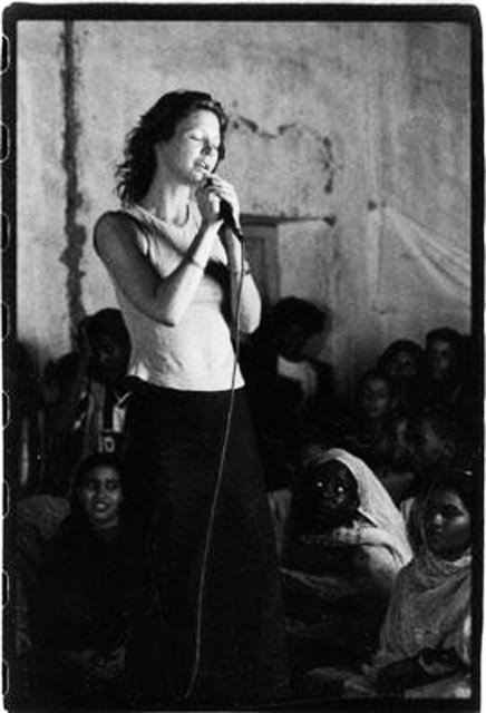 Actress, model, and singer Cynthia Basinet understood the power of the internet to connect people when the medium rocketed her song “Santa Baby” around the world. The empowerment and self-determination she experienced prompted her to seek new connections in new ways. In May 2001 she sang for a different audiencerefugees living in the western Sahara desert. More than 80 per cent women and children, 200,000 refugees are struggling to survive in the southwest corner of Algeria. Their refusal to return home and their fight for self-determination captured the attention of Cynthia Basinet.